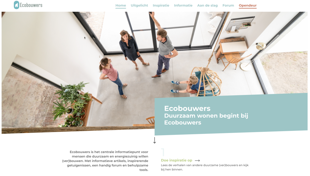 Met Ecobouwers.be beheert Bond Beter Leefmilieu de grootste website rond duurzaam bouwen in Vlaanderen, met de bijhorende jaarlijkse opendeur in november. In 2022 was het tijd om ook deze te vernieuwen waarbij de huisstijl van Bond Beter Leefmilieu en de werking van de website als uitgangspunt genomen werd en aangepast aan de noden van Ecobouwers.